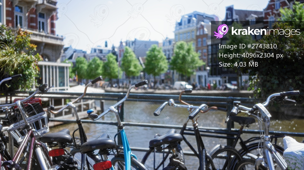 Bicycles parked alongside a canal in amsterdam, netherlands, capturing the essence of city life with blurred background, defocused greenery, and historic architecture. - Kraken Images