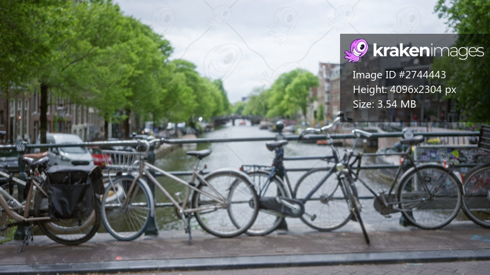 Bicycles parked on a bridge in amsterdam with a blurred view of canals and historic buildings under a cloudy sky captured in a defocused aesthetic.