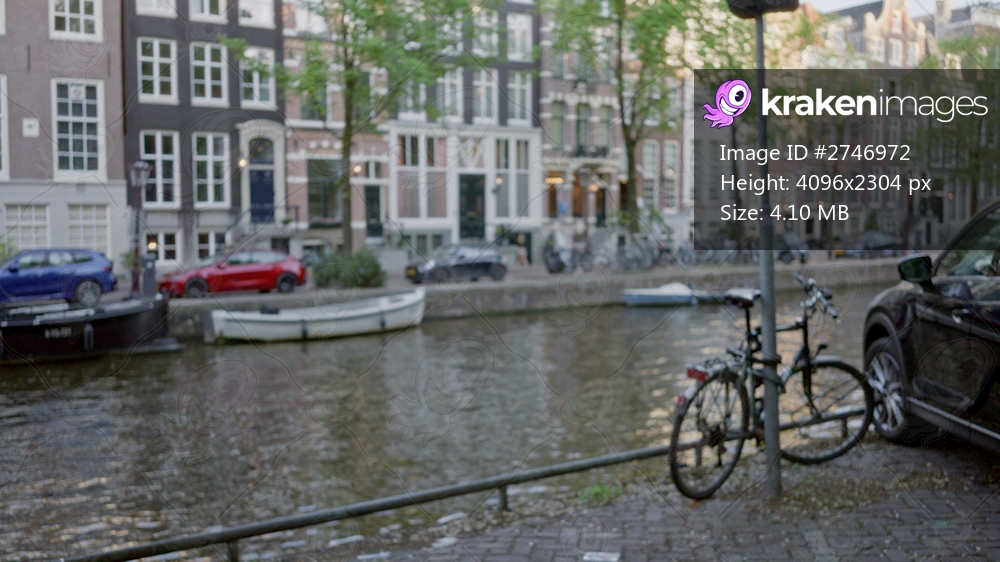 Bikes parked along the picturesque amsterdam canal under a blurred, defocused background of traditional dutch houses and vibrant trees reflecting in the water. - Kraken Images