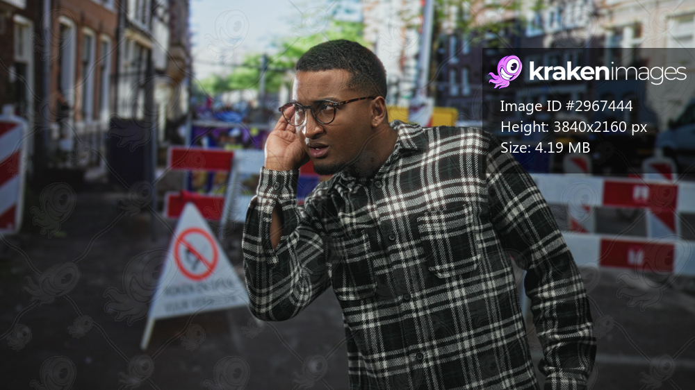 Black man adjusts eyeglasses with hand while listening beside street construction barriers and warning sign; alertness safety.