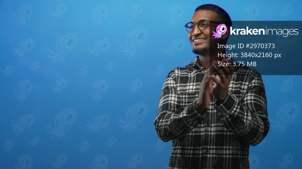 Black man clapping hands in blue studio, smiling, wearing glasses and plaid shirt; joy celebration warmth.