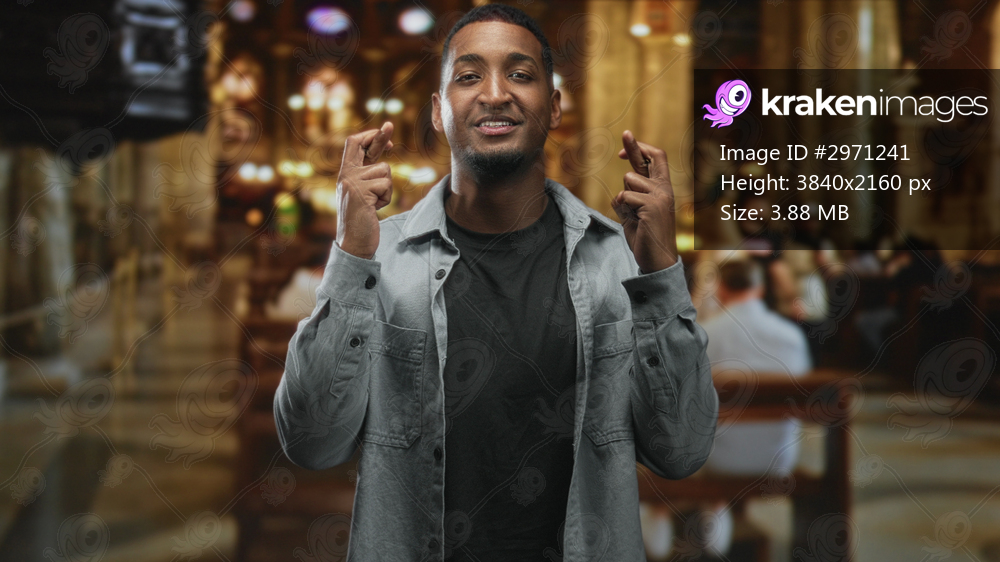 Black man with fingers crossed, hands visible and smiling while standing among wooden pews in a building, ornate church interior with blurred congregants; hopeful faith. - Kraken Images