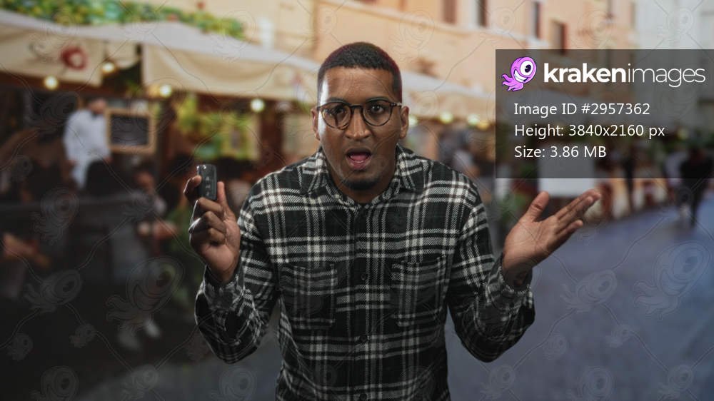 Black man holding a car key fob with an open palm questioning gesture at an outdoor street cafe while pressing the remote; frustration waiting.