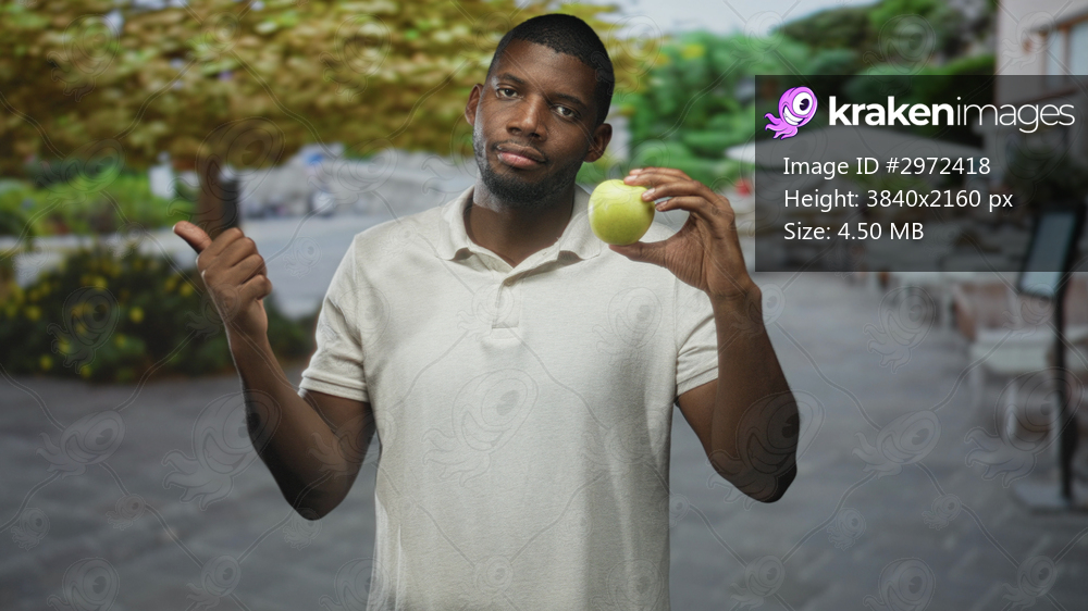 Black man holding a green apple and showing thumb up on street cafe patio wearing white polo while facing camera; confidence approval.