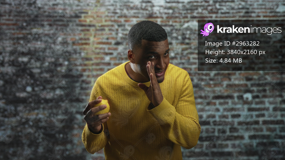 Black man holding a lemon with hands and gesturing near face in a studio with brick wall; curiosity freshness simplicity.