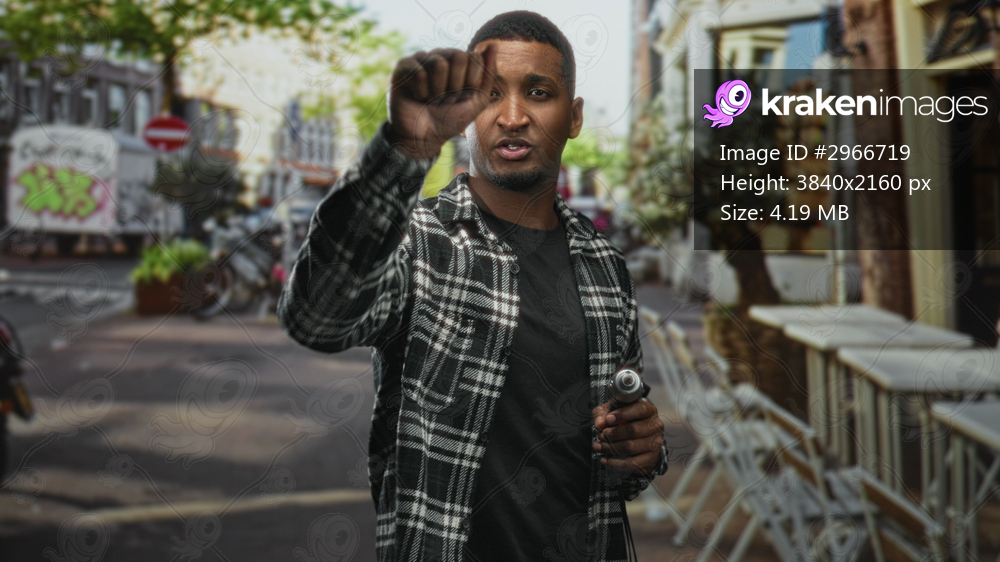 Black man holding an electric screwdriver, palm up and open hand gesture in a busy street cafe sidewalk, wearing plaid shirt and looking puzzled; repair uncertainty. - Kraken Images