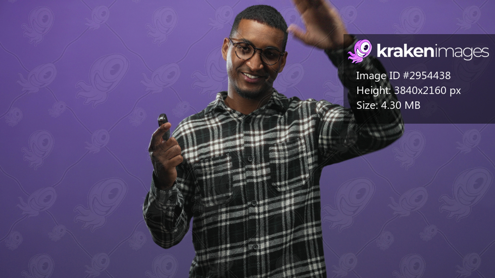 Black man holding car keys and saluting with hand in studio purple backdrop, wearing plaid flannel shirt and glasses; confidence.