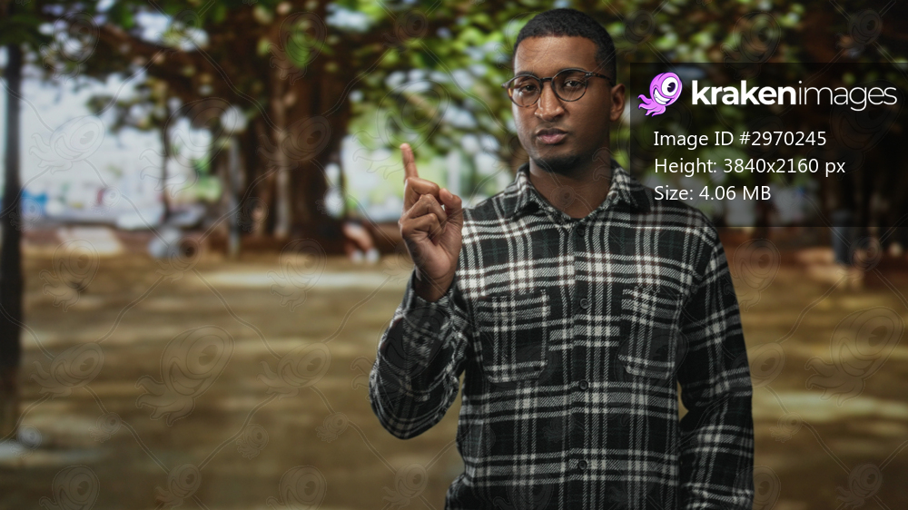 Black man holding up finger in a pointing gesture in forest with trees and bench, wearing flannel shirt; thoughtful focus.