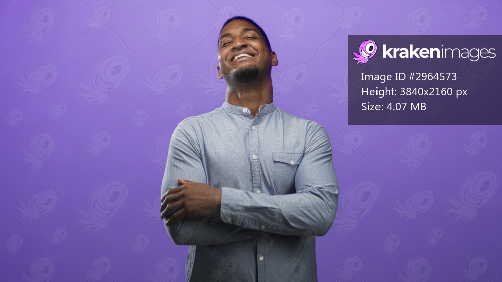 Black man in blue shirt with hand covering mouth laughing and arm crossed against a purple studio backdrop; amusement.