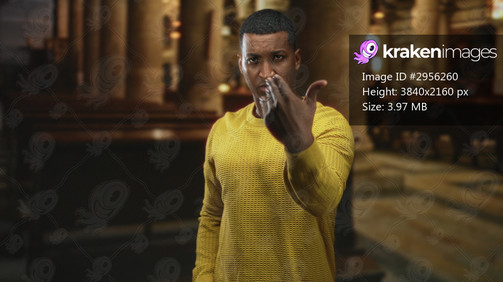 Black man in yellow sweater points finger toward camera inside an ornate building interior with pews and columns; confrontation.