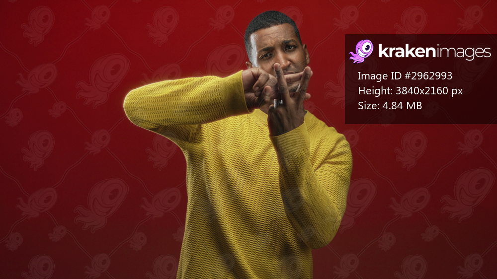 Black man making hashtag hand gesture and later a peace sign with hands, wearing yellow sweater against red seamless backdrop in studio; playful connection confidence. - Kraken Images
