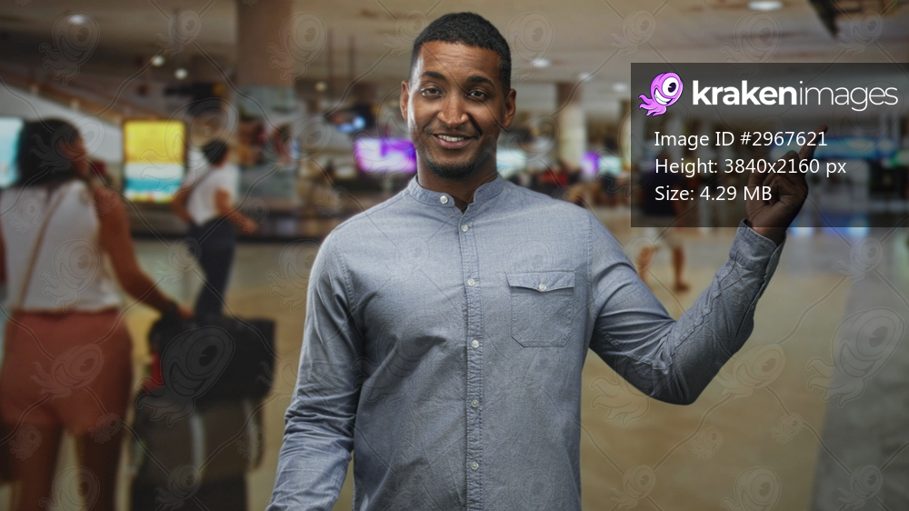 Black man pointing finger at arrivals board with visible hand and button shirt in airport; confidence welcome.