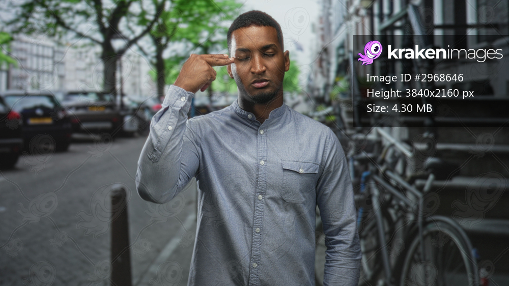 Black man points finger to temple and shows middle finger on a street lined with bicycles and parked cars; defiance urban attitude.