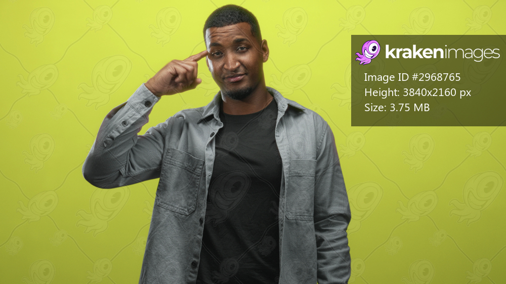 Black man points finger to temple, wearing gray shirt and black tee against a lime green studio backdrop; thoughtful.