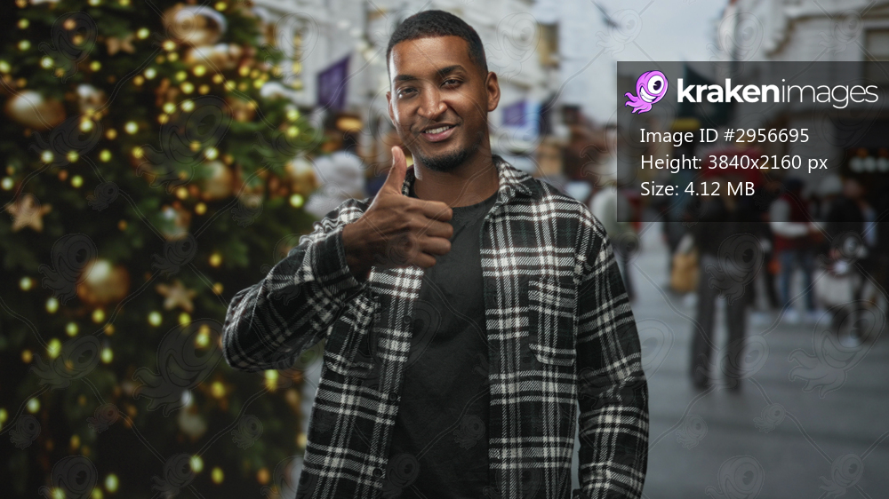 Black man showing thumbs up with visible thumb and hand on a busy street beside a decorated christmas tree; optimism holiday cheer.