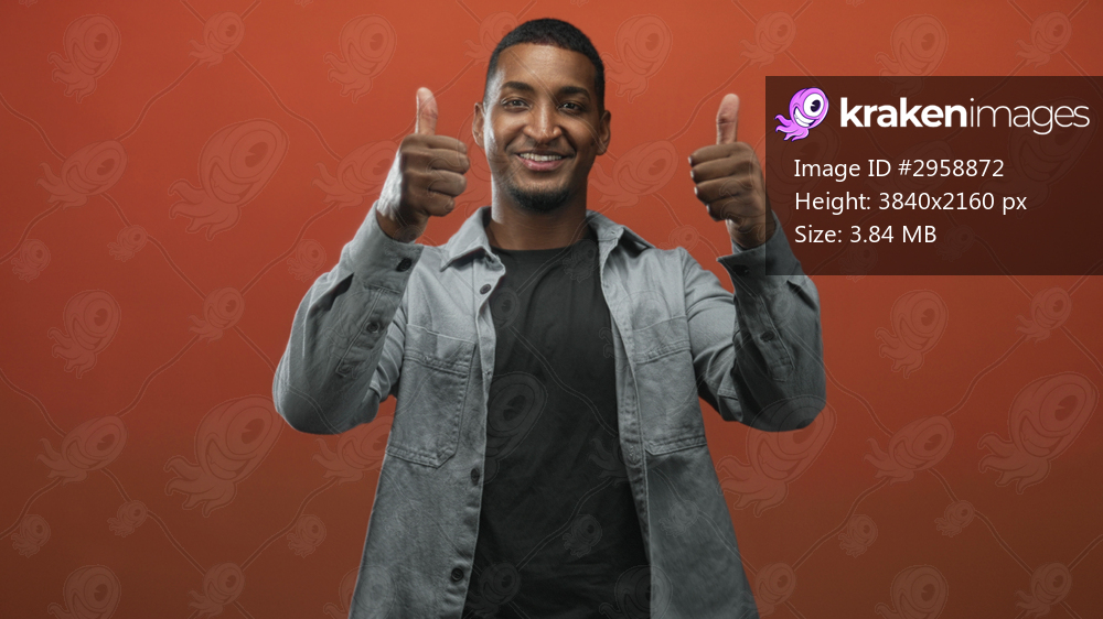 Black man showing two thumbs up and smiling, wearing a gray button shirt over a black tee, standing centered against an orange backdrop in studio; confidence. - Kraken Images