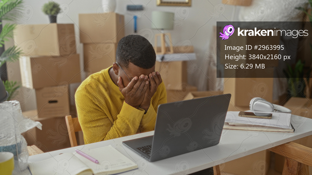 Black man typing on laptop at desk in studio surrounded by cardboard moving boxes and headphones; moving fatigue.