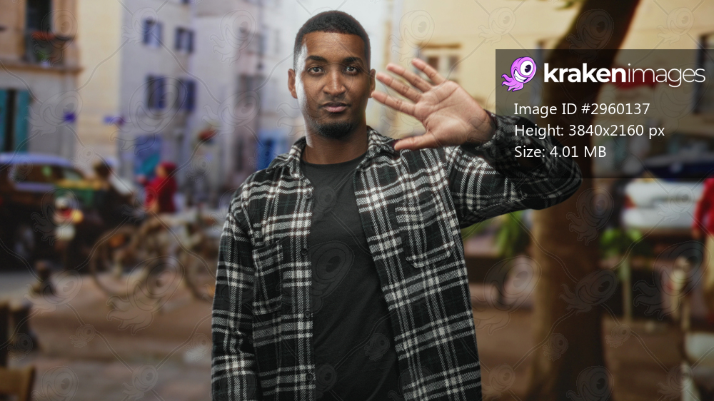Black man waving hand on an urban street beside bicycles, wearing plaid shirt and black t shirt; friendly greeting.