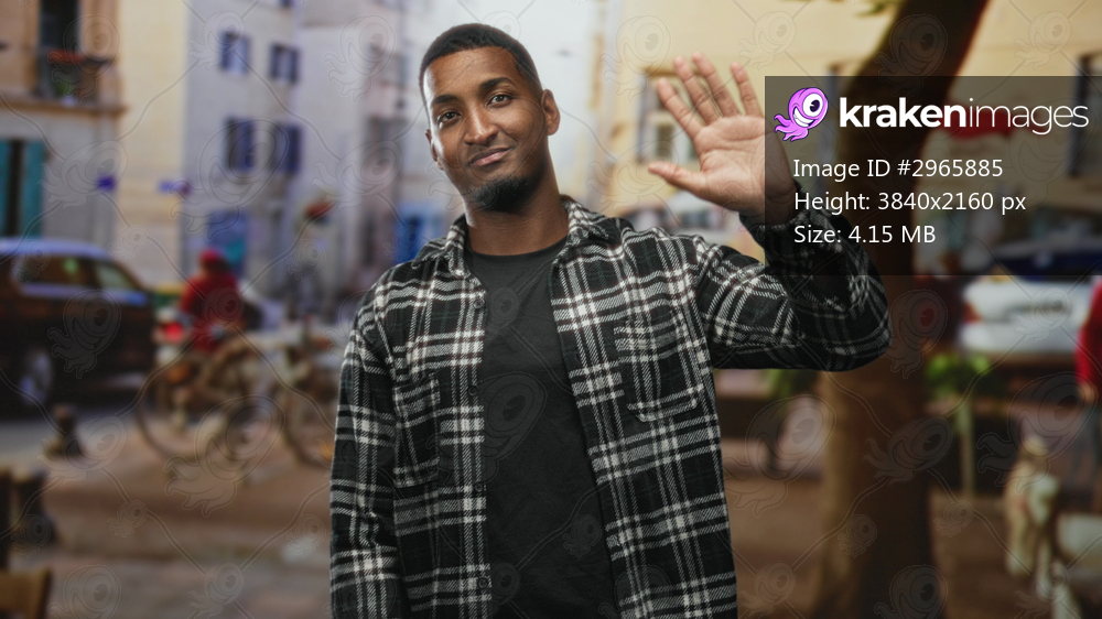 Black man waving hand on an urban street beside bicycles, wearing plaid shirt and black t shirt; friendly greeting.