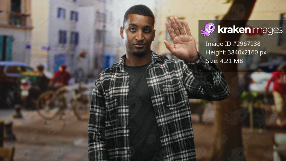 Black man waving hand on an urban street beside bicycles, wearing plaid shirt and black t shirt; friendly greeting.