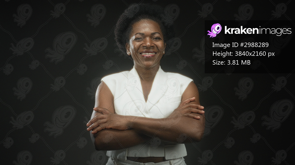 Black woman with arms crossed, smiling and facing camera, wearing white vest with visible forearms in studio; confidence empowerment.