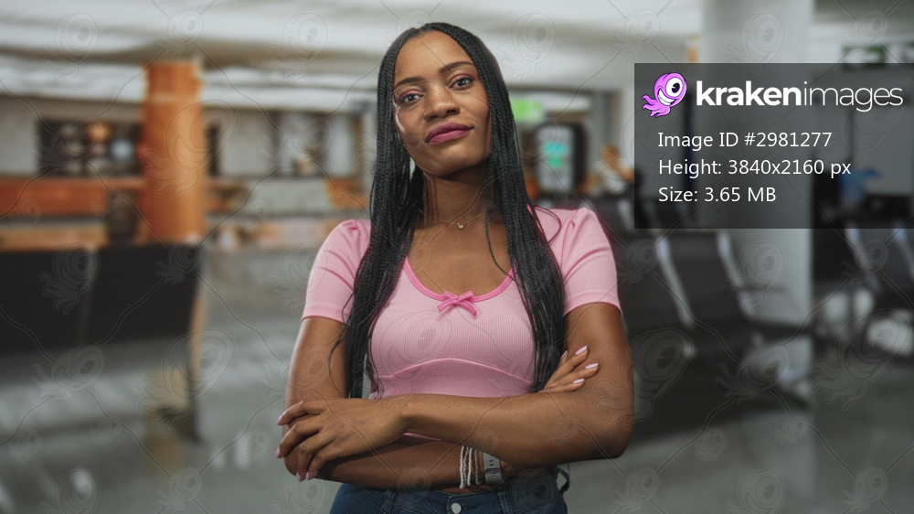 Black woman arms crossed with visible hands wearing a pink tshirt standing in an airport seating area; confidence.