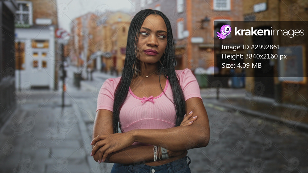 Black woman with arms crossed wearing a pink crop top showing bare midriff on a wet cobblestone street lined with brick buildings; confidence.