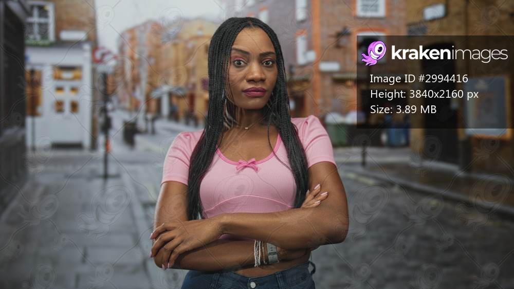 Black woman with arms crossed wearing a pink crop top showing bare midriff on a wet cobblestone street lined with brick buildings; confidence.