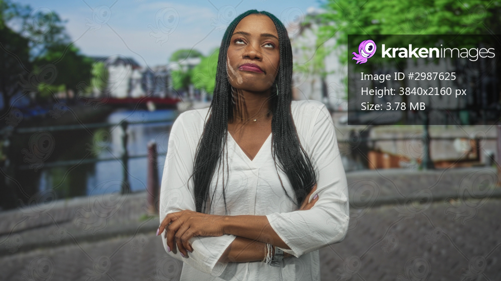 Black woman with braided hair, arms crossed and chin raised on a canal street by a bridge and waterside buildings; defiance.