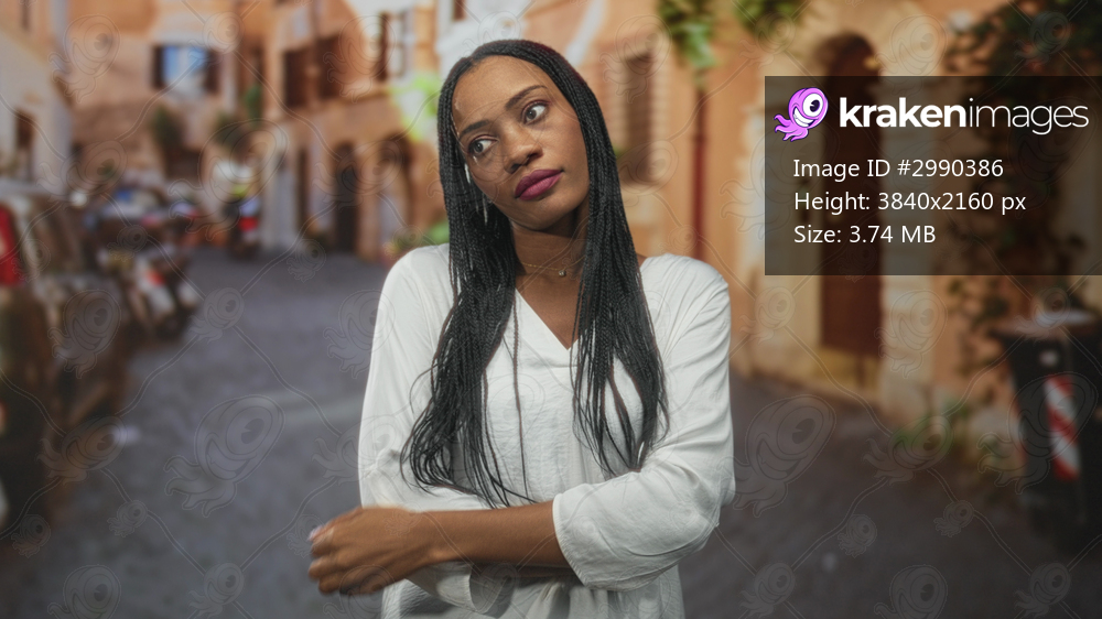 Black woman with braided hair, arms crossed and head tilted in a narrow cobblestone street; pensive reflection.