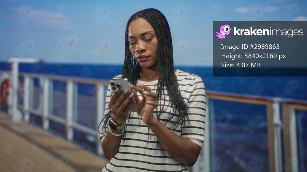Black woman with braided hair holding a smartphone with both hands and reading messages while standing on a cruise ship deck near railings under blue sky; contemplation. - Kraken Images
