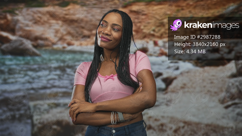 Black woman with braided hair and pink top, arms crossed and smiling, studio with beach backdrop; confidence contemplation.