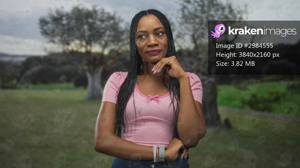 Black woman with braided hair rests chin on hand wearing pink top and smartwatch in a forest; contemplation poise.