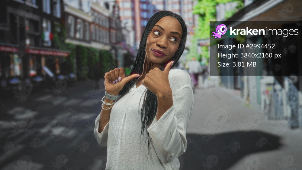 Black woman with braided hair, thumbs pointing to chest, wearing white blouse, visible hands and wrist bracelets, smiling on a busy street with storefronts and terraces; confidence empowerment. - Kraken Images