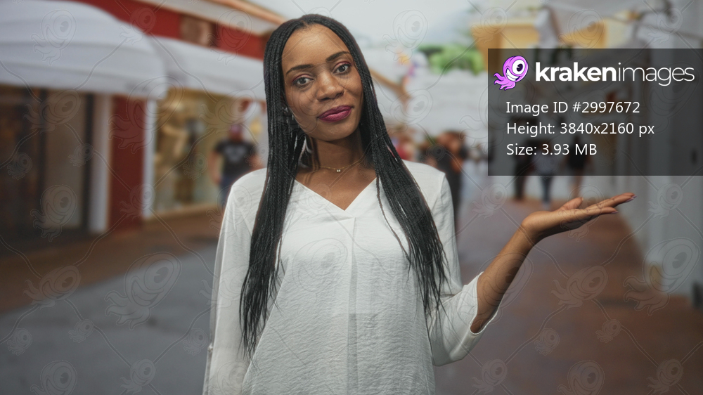 Black woman with braids holds out open palm while standing on a busy pedestrian street; quiet contemplation.