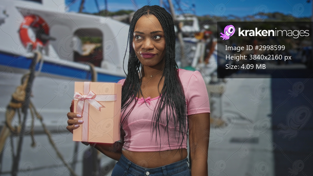 Black woman with braids holds pink gift box with hands and smiles against a boat mural in studio; joyful celebration.
