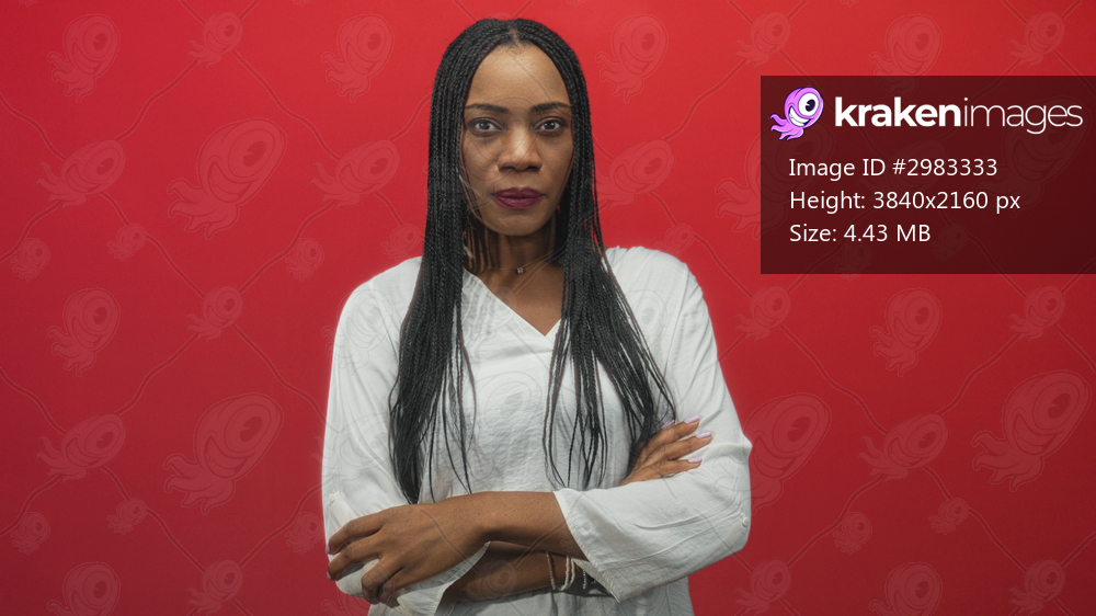 Black woman with clenched fist and crossed arms in studio, white blouse and bracelets; confidence empowerment resilience.