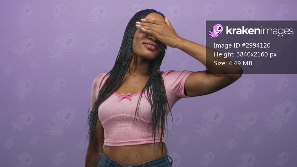 Black woman covers eyes with hand showing midriff in a purple studio, smiling with braided hair and pink shirt; joy confidence.