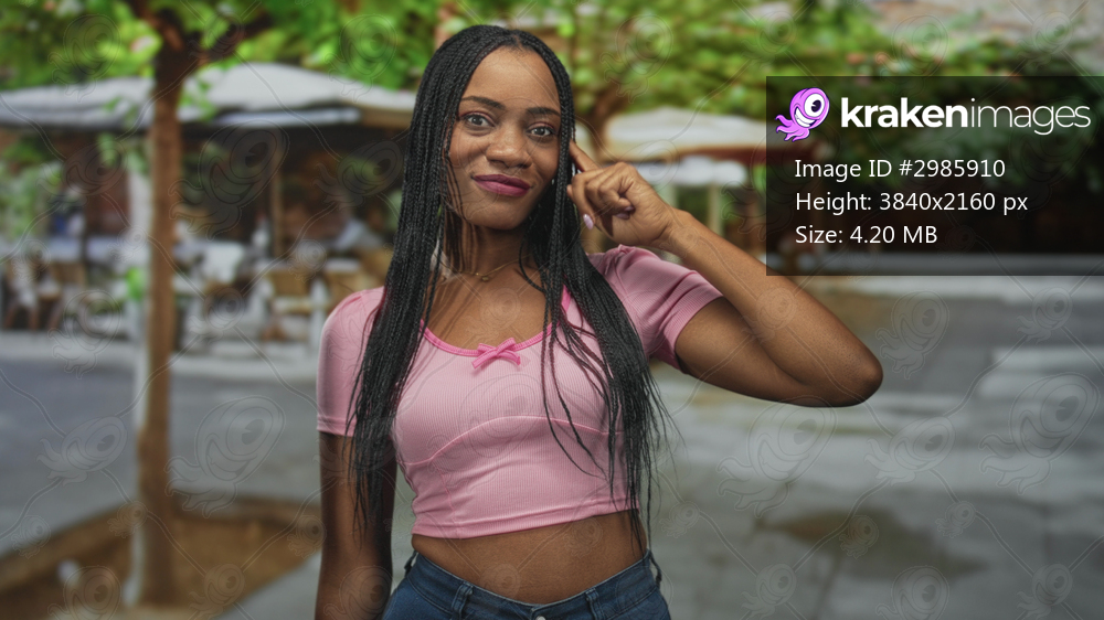 Black woman finger to temple showing waist on a street cafe patio with trees, umbrellas and pavement, smiling in a pink crop shirt; confidence.