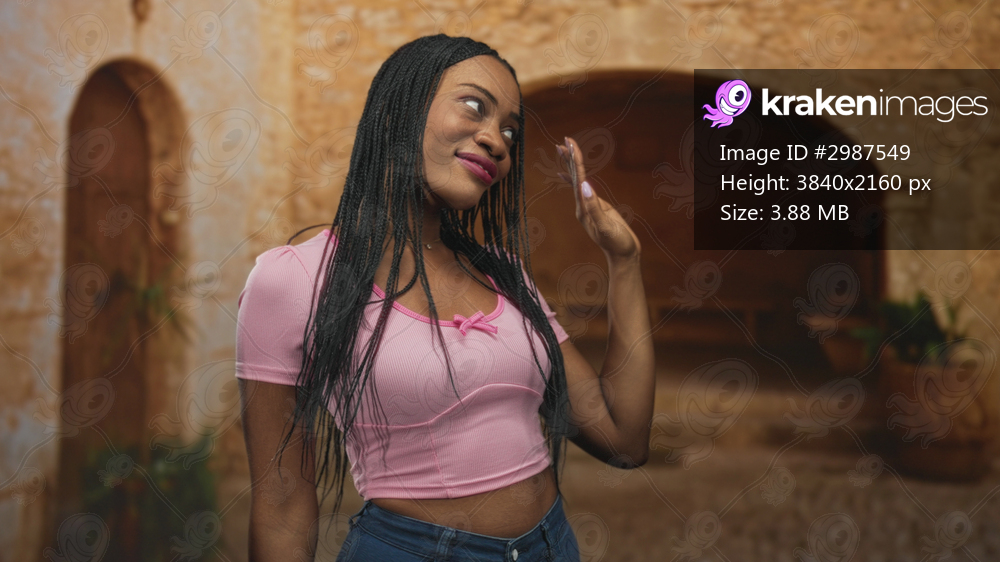 Black woman flips braided hair with raised hand, wearing pink shirt and visible midriff in a stone street courtyard; confidence attitude.