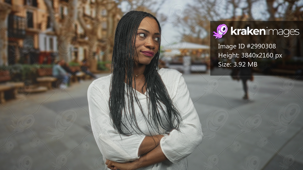 Black woman with hand to forehead and closed eyes on a street, wearing white blouse and bracelets; quiet contemplation.