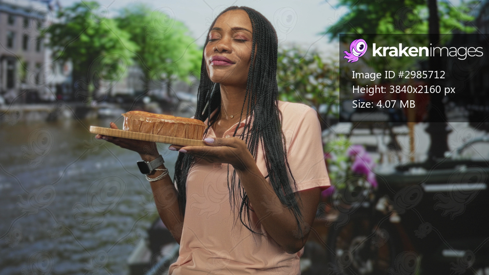 Black woman holding a cake on a street canal, eyes closed and smelling pastry with hands supporting wooden board; culinary contentment.