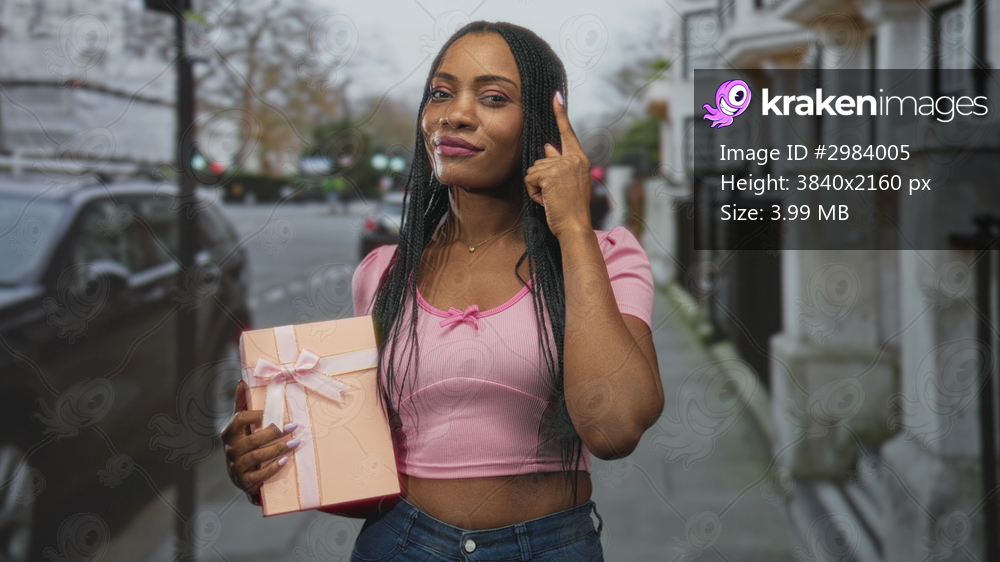 Black woman holding a pink gift box points finger to temple, bare midriff visible, braided hair, on a street with parked cars and stone building facades; confidence celebration. - Kraken Images