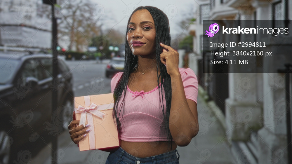Black woman holding a pink gift box points finger to temple, bare midriff visible, braided hair, on a street with parked cars and stone building facades; confidence celebration. - Kraken Images