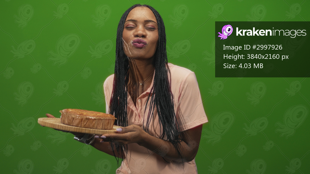 Black woman holding a round cake on a wooden board, hands presenting the pastry to camera in a studio green screen; celebration joy.