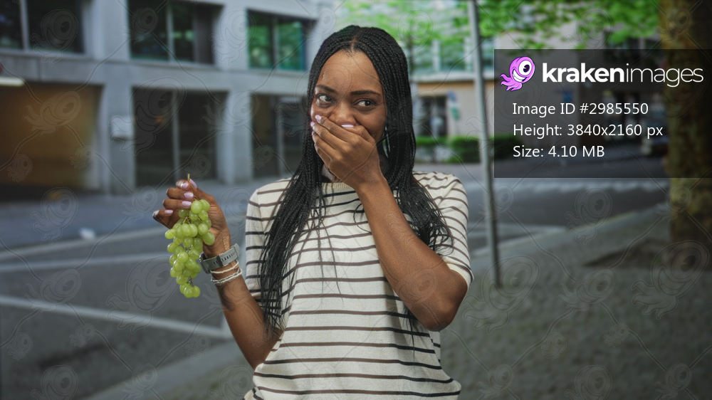 Black woman holding grapes with hand covering mouth on street in front of modern building and sidewalk, smiling softly; playful joy.