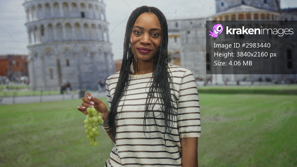 Black woman holding green grapes by hand in front of building with leaning tower and cathedral on grassy lawn, slight smile and relaxed pose; travel memory serenity. - Kraken Images