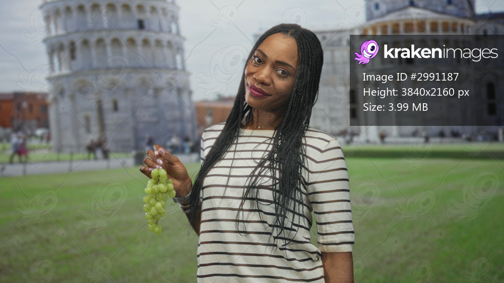 Black woman holding green grapes by hand in front of building with leaning tower and cathedral on grassy lawn, slight smile and relaxed pose; travel memory serenity. - Kraken Images