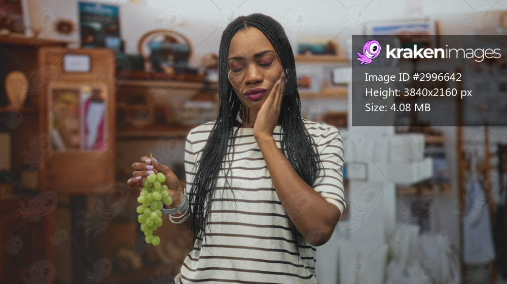 Black woman holding green grapes, hand to cheek gesture with closed eyes inside a building; toothache discomfort.