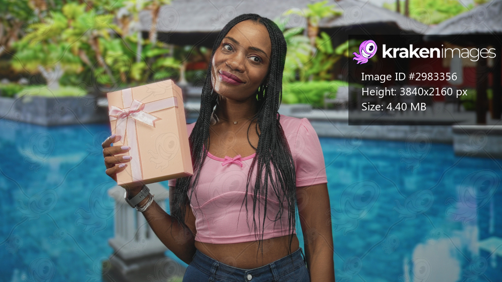 Black woman holding pink gift box by a resort pool at building, smiling with braided hair and cropped pink top; celebration joy.
